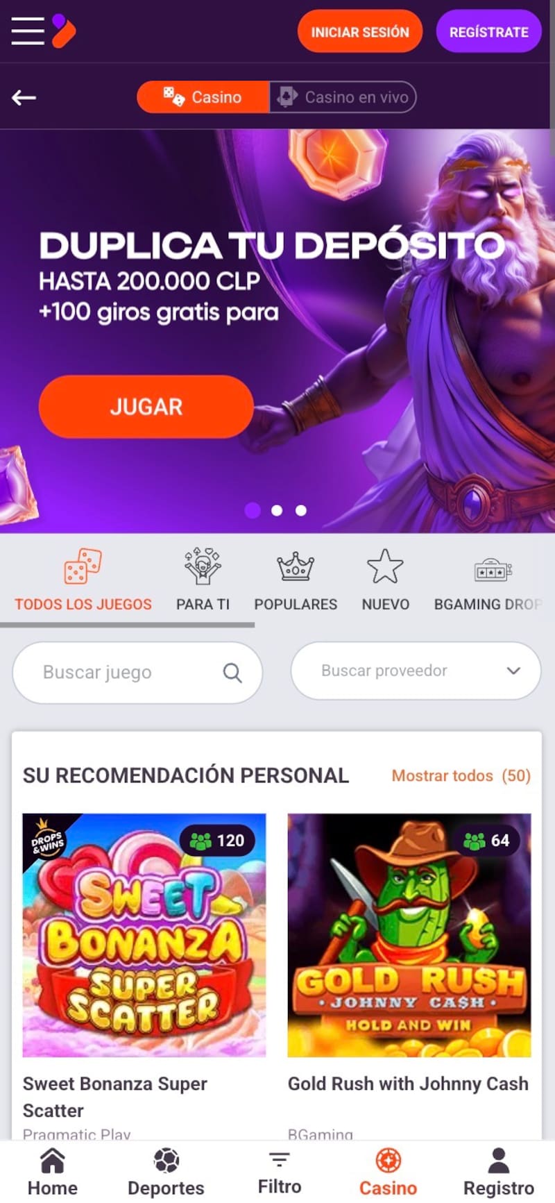 - Bono destacado: 100% hasta $120.000 CLP + 120 giros gratis.