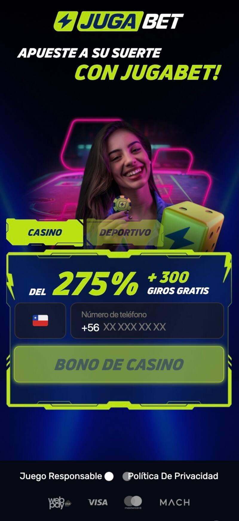 - Pagos: WebPay, Banco de Chile, MACH, Visa, CuentaRUT, MasterCard, Santander, Tether, Khipu, entre otros.Licencia: Antillephone N.V. 8048/JAZ (Curazao).